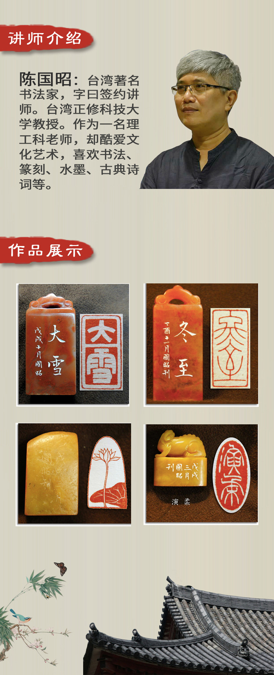 讲师陈国昭:台湾著名书法家,字曰签约讲师。清华大学硕士毕业,台湾正修科技大学教授。作为一名理工科老师,却酷爱文化艺术,喜欢书法、篆刻、水墨、古典音乐、古典诗词等。尤其是书法方面,数十年来一直坚持临摹古帖,很多名帖都曾一比一临摹数遍,是当今力学传统的典型,被网友称为“临帖复印机”。