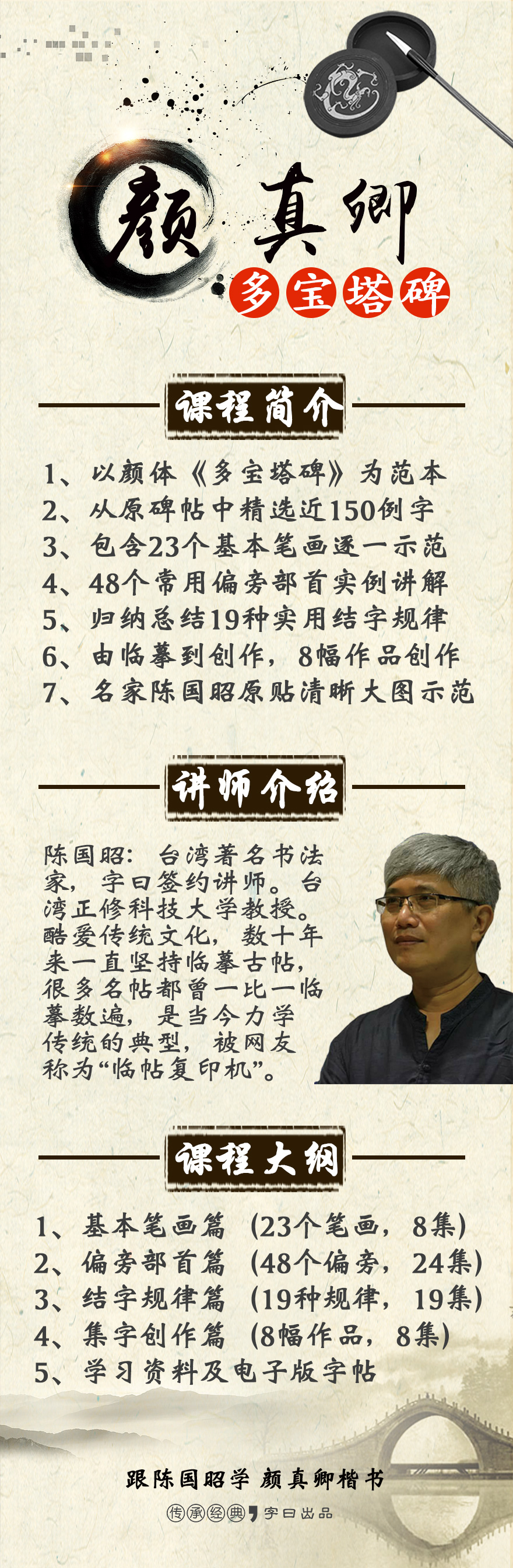 本课程由陈国昭老师主讲,精选颜真卿《多宝塔碑》中的代表性例字,分别从笔画、偏旁、结构、创作等方面进行解析示范。