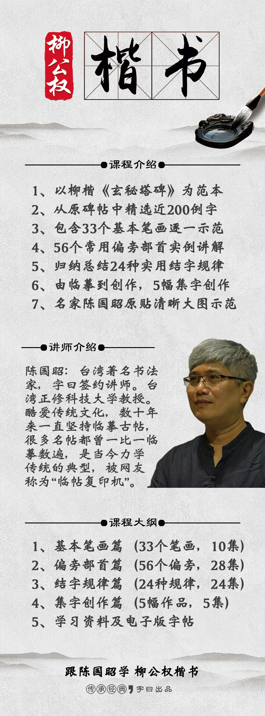 本套课程主要以《玄秘塔碑》为范本,通过对全碑的反复研读,我们精选了近200个例字。课程包含33个基本笔画,56个偏旁部首,24种结构规律总结,5幅集字创作。再加上书法名家陈国昭老师深入浅出的讲解示范,希望能帮你轻松学会柳楷。