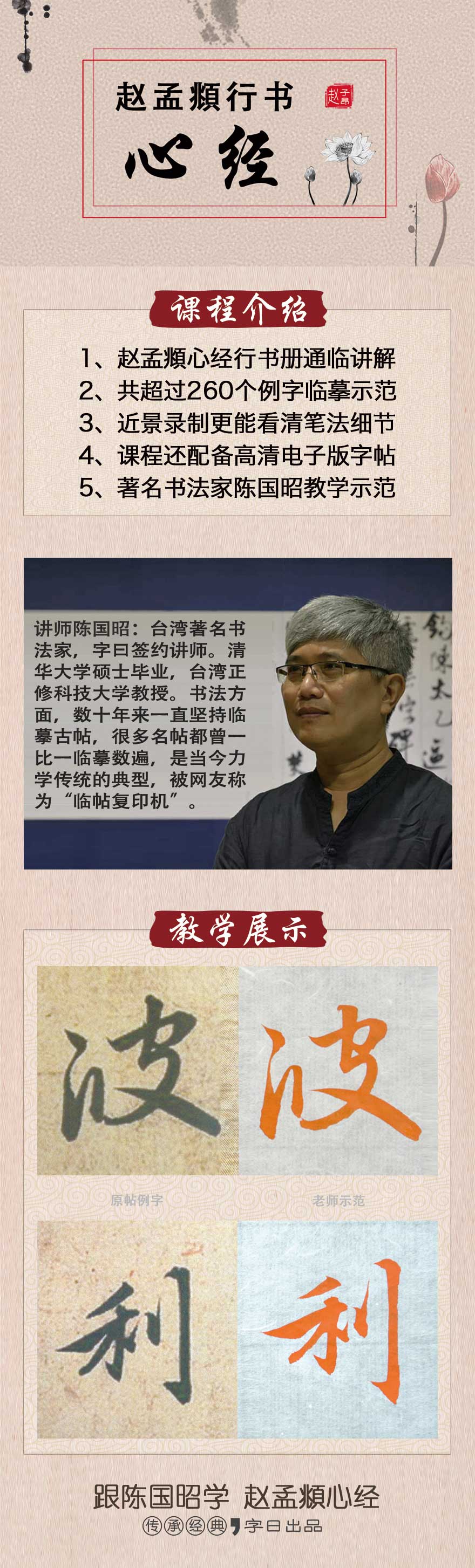 本套课程共56集,由陈国昭老师主讲,对赵孟頫心经行书册全帖正文例字进行逐一讲解示范,带你学习领略赵孟頫行楷的笔法及结构应用。