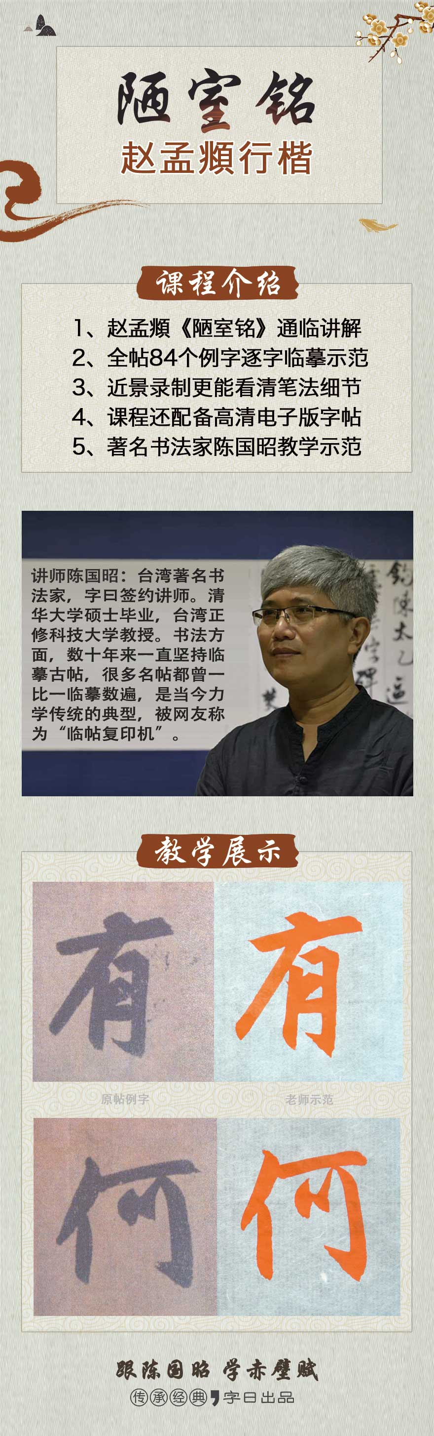 讲师陈国昭:台湾著名书法家,字曰签约讲师。清华大学硕士毕业,台湾正修科技大学教授。作为一名理工科老师,却酷爱文化艺术,喜欢书法、篆刻、水墨、古典音乐、古典诗词等。尤其是书法方面,数十年来一直坚持临摹古帖,很多名帖都曾一比一临摹数遍,是当今力学传统的典型,被网友称为“临帖复印机”。