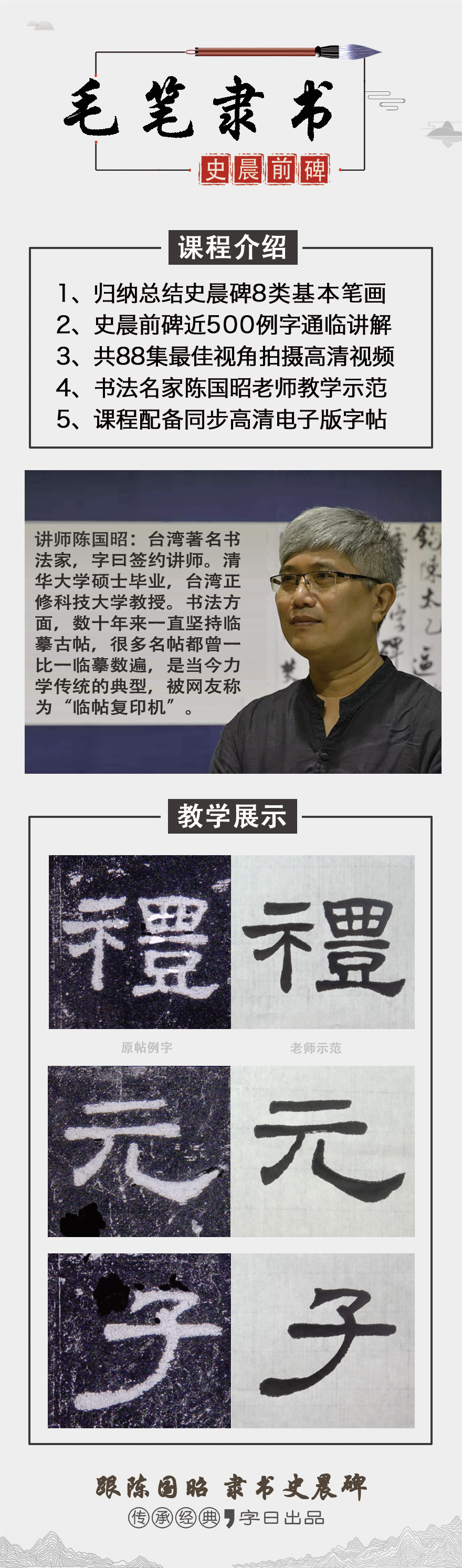 讲师陈国昭:台湾著名书法家,字曰签约讲师。清华大学硕士毕业,台湾正修科技大学教授。作为一名理工科老师,却酷爱文化艺术,喜欢书法、篆刻、水墨、古典音乐、古典诗词等。尤其是书法方面,数十年来一直坚持临摹古帖,很多名帖都曾一比一临摹数遍,是当今力学传统的典型,被网友称为“临帖复印机”。