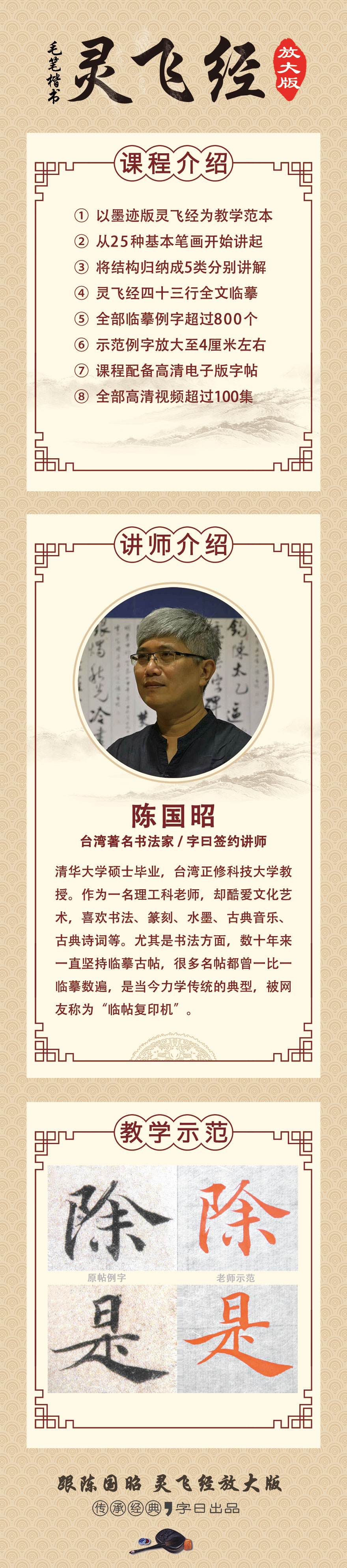 本套课程选择墨迹版《灵飞经》作为教学范本,共分为三大部分,分别包括: 基本笔画、字形结构和原帖临摹。