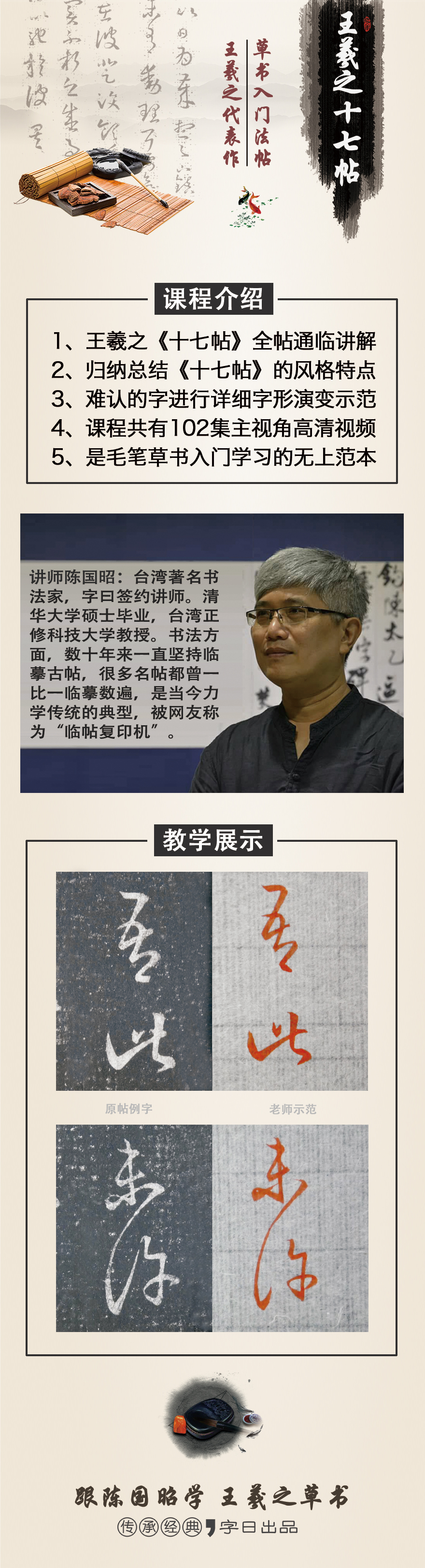 讲师陈国昭:台湾著名书法家,字曰签约讲师。清华大学硕士毕业,台湾正修科技大学教授。作为一名理工科老师,却酷爱文化艺术,喜欢书法、篆刻、水墨、古典音乐、古典诗词等。尤其是书法方面,数十年来一直坚持临摹古帖,很多名帖都曾一比一临摹数遍,是当今力学传统的典型,被网友称为“临帖复印机”。