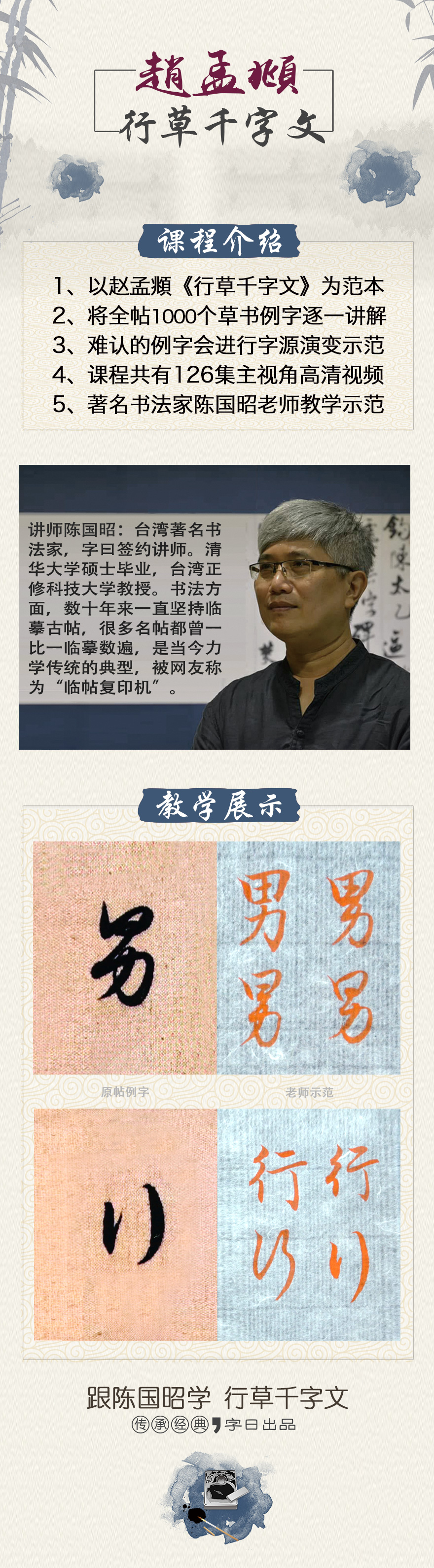讲师陈国昭:台湾著名书法家,字曰签约讲师。清华大学硕士毕业,台湾正修科技大学教授。作为一名理工科老师,却酷爱文化艺术,喜欢书法、篆刻、水墨、古典音乐、古典诗词等。尤其是书法方面,数十年来一直坚持临摹古帖,很多名帖都曾一比一临摹数遍,是当今力学传统的典型,被网友称为“临帖复印机”。