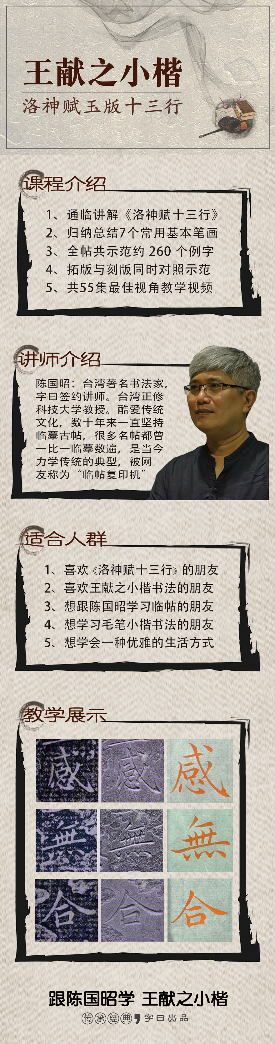 讲师陈国昭:台湾著名书法家,字曰签约讲师。清华大学硕士毕业,台湾正修科技大学教授。作为一名理工科老师,却酷爱文化艺术,喜欢书法、篆刻、水墨、古典音乐、古典诗词等。尤其是书法方面,数十年来一直坚持临摹古帖,很多名帖都曾一比一临摹数遍,是当今力学传统的典型,被网友称为“临帖复印机”。