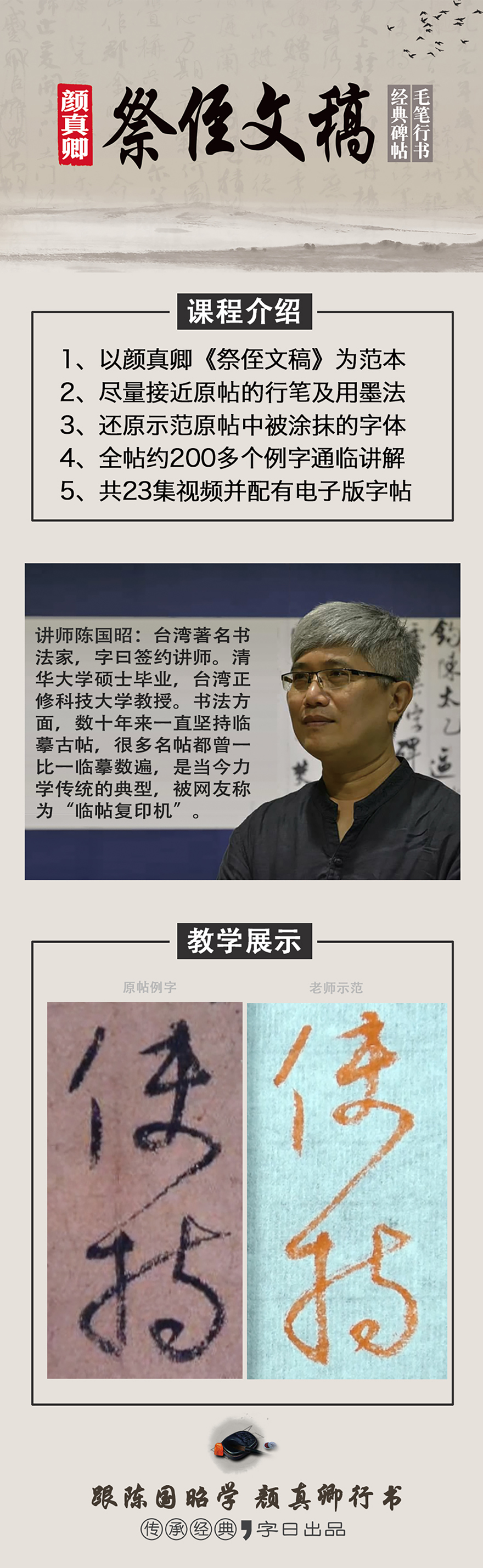 讲师陈国昭:台湾著名书法家,字曰签约讲师。清华大学硕士毕业,台湾正修科技大学教授。作为一名理工科老师,却酷爱文化艺术,喜欢书法、篆刻、水墨、古典音乐、古典诗词等。尤其是书法方面,数十年来一直坚持临摹古帖,很多名帖都曾一比一临摹数遍,是当今力学传统的典型,被网友称为“临帖复印机”。