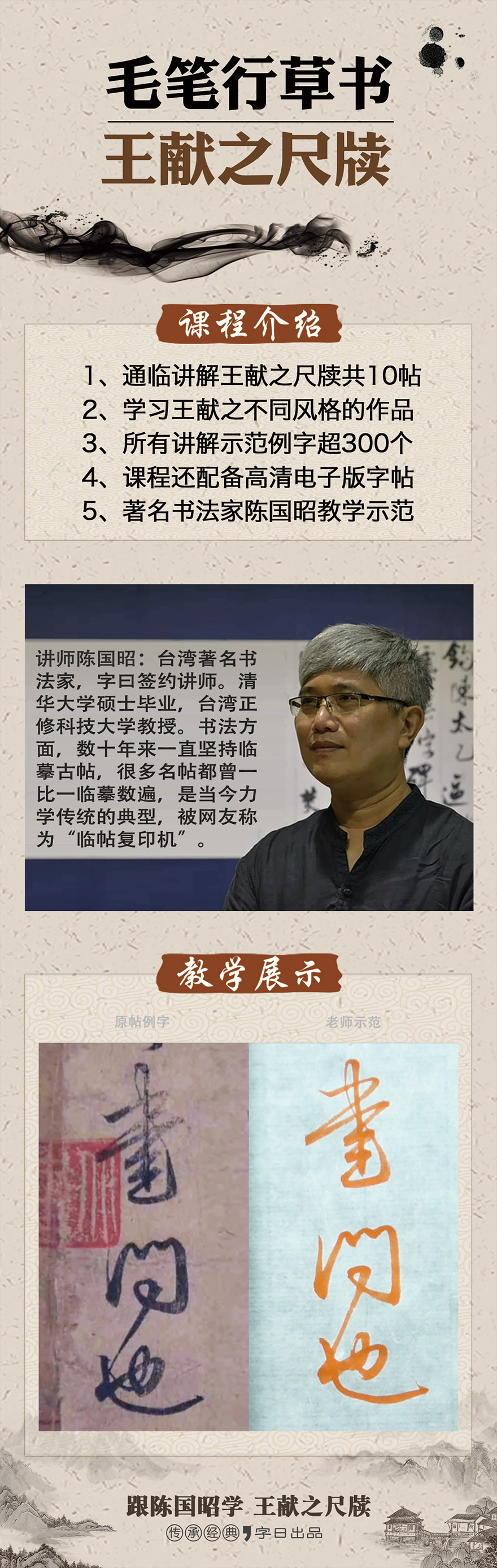 讲师陈国昭:台湾著名书法家,字曰签约讲师。清华大学硕士毕业,台湾正修科技大学教授。作为一名理工科老师,却酷爱文化艺术,喜欢书法、篆刻、水墨、古典音乐、古典诗词等。尤其是书法方面,数十年来一直坚持临摹古帖,很多名帖都曾一比一临摹数遍,是当今力学传统的典型,被网友称为“临帖复印机”。